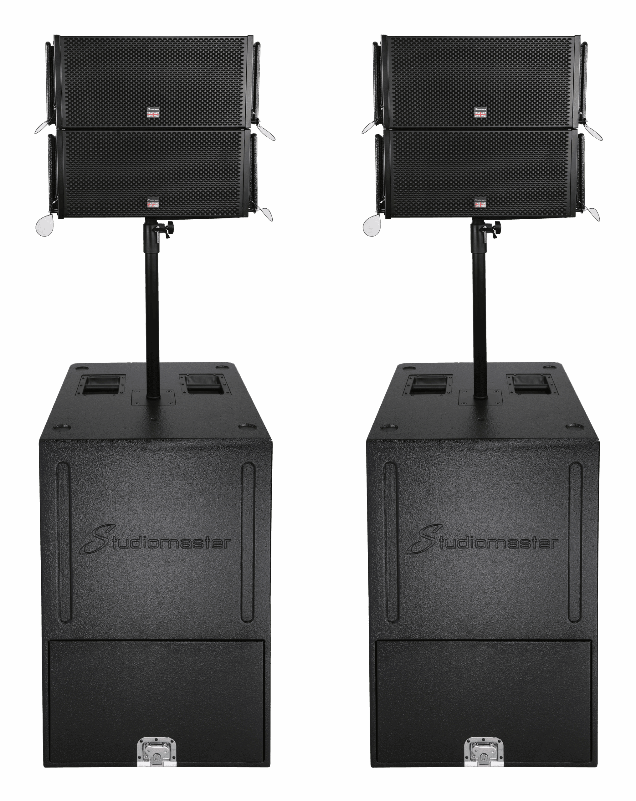 The Platform system comprises 2x 18″ active sub bass units, each topper with 2x 10″ mid/top cabinets, to create a portable and powerful 4800W compact array system.